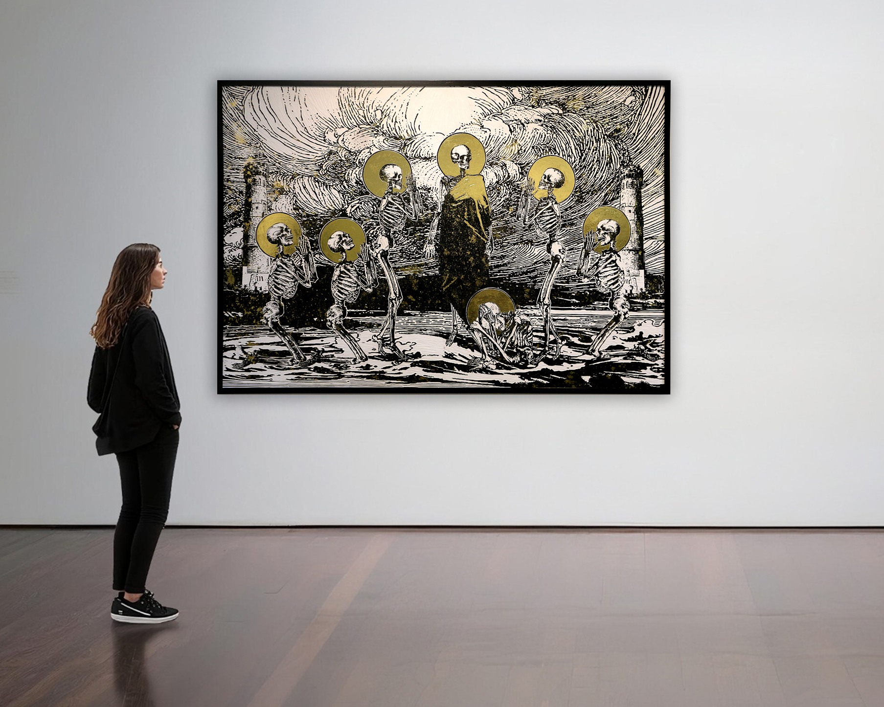 แผ่นไม้ที่เคยทำหน้าที่เป็นแม่พิมพ์จึงถูกนำมาใช้เป็นพื้นผิวของการสร้างสรรค์โดยตรง ลวดลายถูกแกะสลักด้วยมือ ส่วนพื้นที่ที่ไม่ถูกแกะถูกกลิ้งด้วยหมึกภาพพิมพ์เพื่อสร้างน้ำหนักสีดำ ขณะที่ร่องรอยจากการแกะถูกเติมด้วยสีอะคริลิกเพื่อสร้างมิติและความเคลื่อนไหว บางผลงานมีการปัดทองทับบนพื้นผิวหมึกดำ เพื่อเพิ่มชั้นของความหมายและการรับรู้