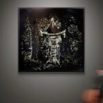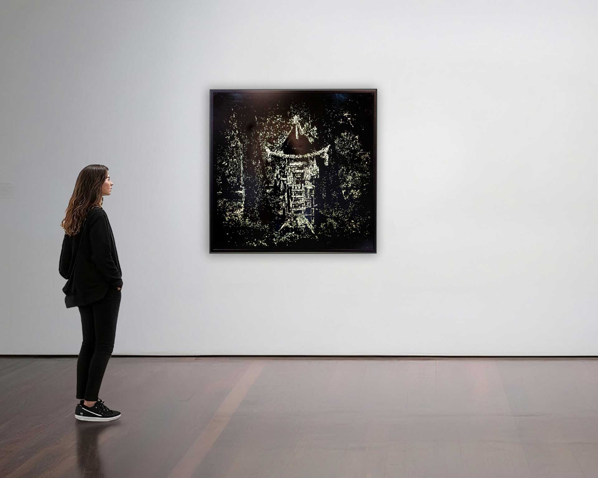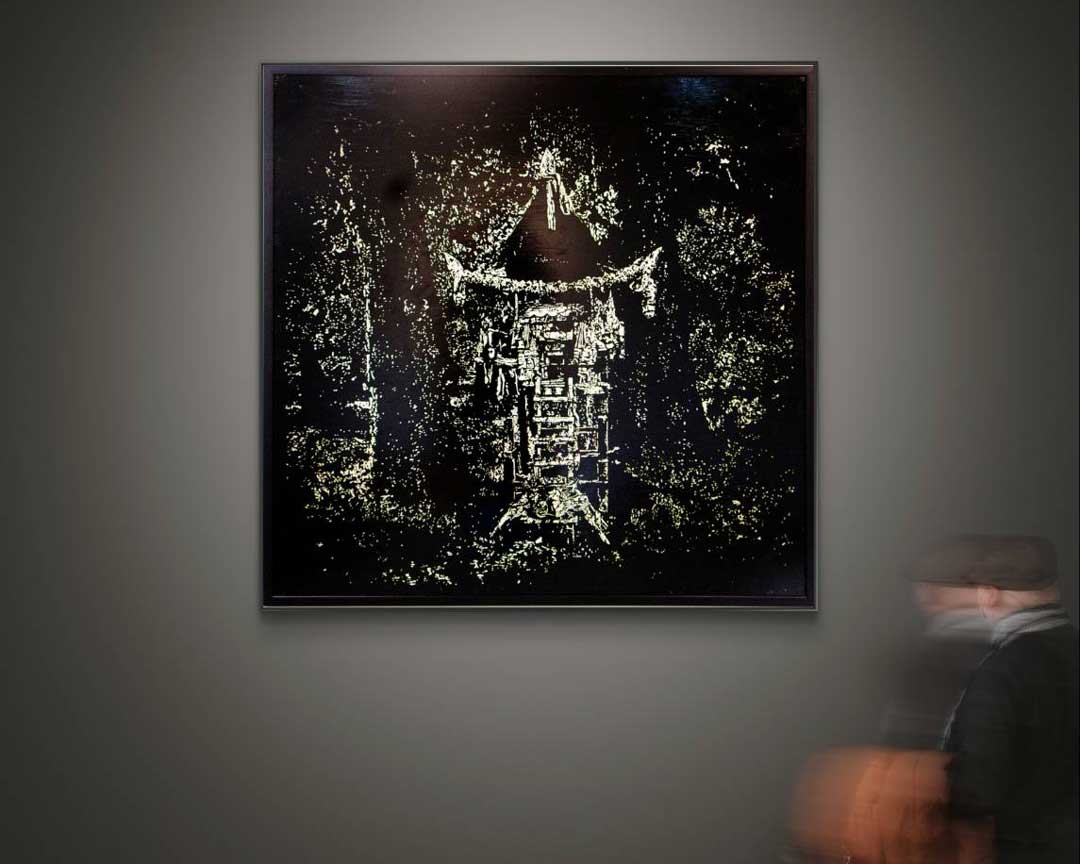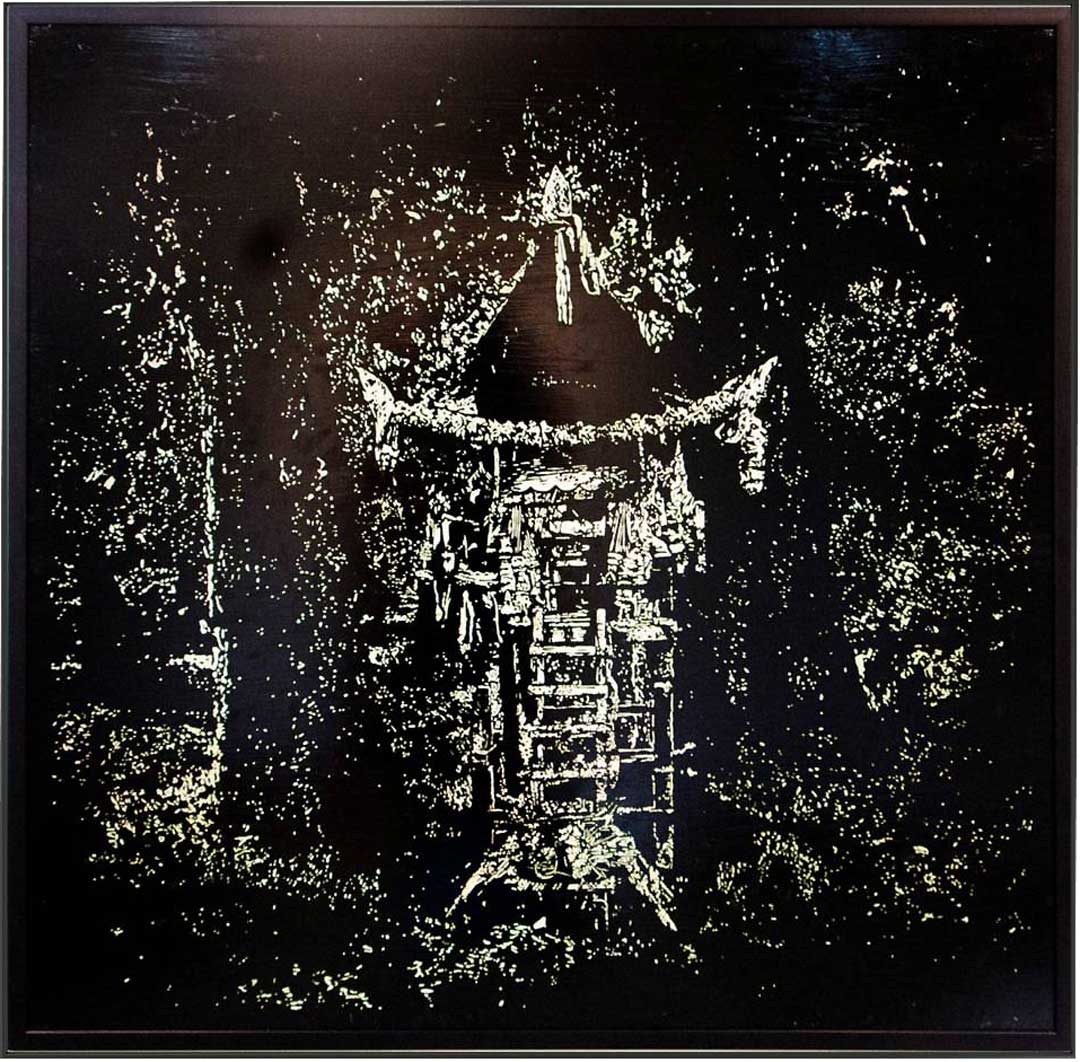 แผ่นไม้ที่เคยทำหน้าที่เป็นแม่พิมพ์จึงถูกนำมาใช้เป็นพื้นผิวของการสร้างสรรค์โดยตรง ลวดลายถูกแกะสลักด้วยมือ ส่วนพื้นที่ที่ไม่ถูกแกะถูกกลิ้งด้วยหมึกภาพพิมพ์เพื่อสร้างน้ำหนักสีดำ ขณะที่ร่องรอยจากการแกะถูกเติมด้วยสีอะคริลิกเพื่อสร้างมิติและความเคลื่อนไหว บางผลงานมีการปัดทองทับบนพื้นผิวหมึกดำ เพื่อเพิ่มชั้นของความหมายและการรับรู้