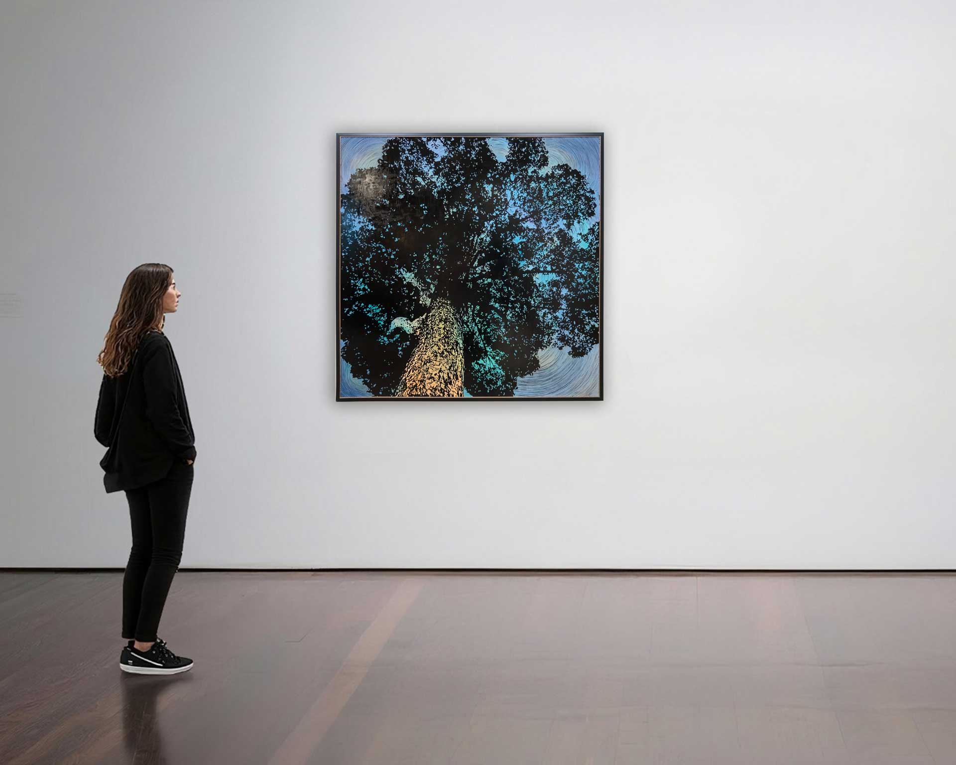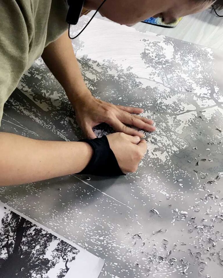 แผ่นไม้ที่เคยทำหน้าที่เป็นแม่พิมพ์จึงถูกนำมาใช้เป็นพื้นผิวของการสร้างสรรค์โดยตรง ลวดลายถูกแกะสลักด้วยมือ ส่วนพื้นที่ที่ไม่ถูกแกะถูกกลิ้งด้วยหมึกภาพพิมพ์เพื่อสร้างน้ำหนักสีดำ ขณะที่ร่องรอยจากการแกะถูกเติมด้วยสีอะคริลิกเพื่อสร้างมิติและความเคลื่อนไหว บางผลงานมีการปัดทองทับบนพื้นผิวหมึกดำ เพื่อเพิ่มชั้นของความหมายและการรับรู้