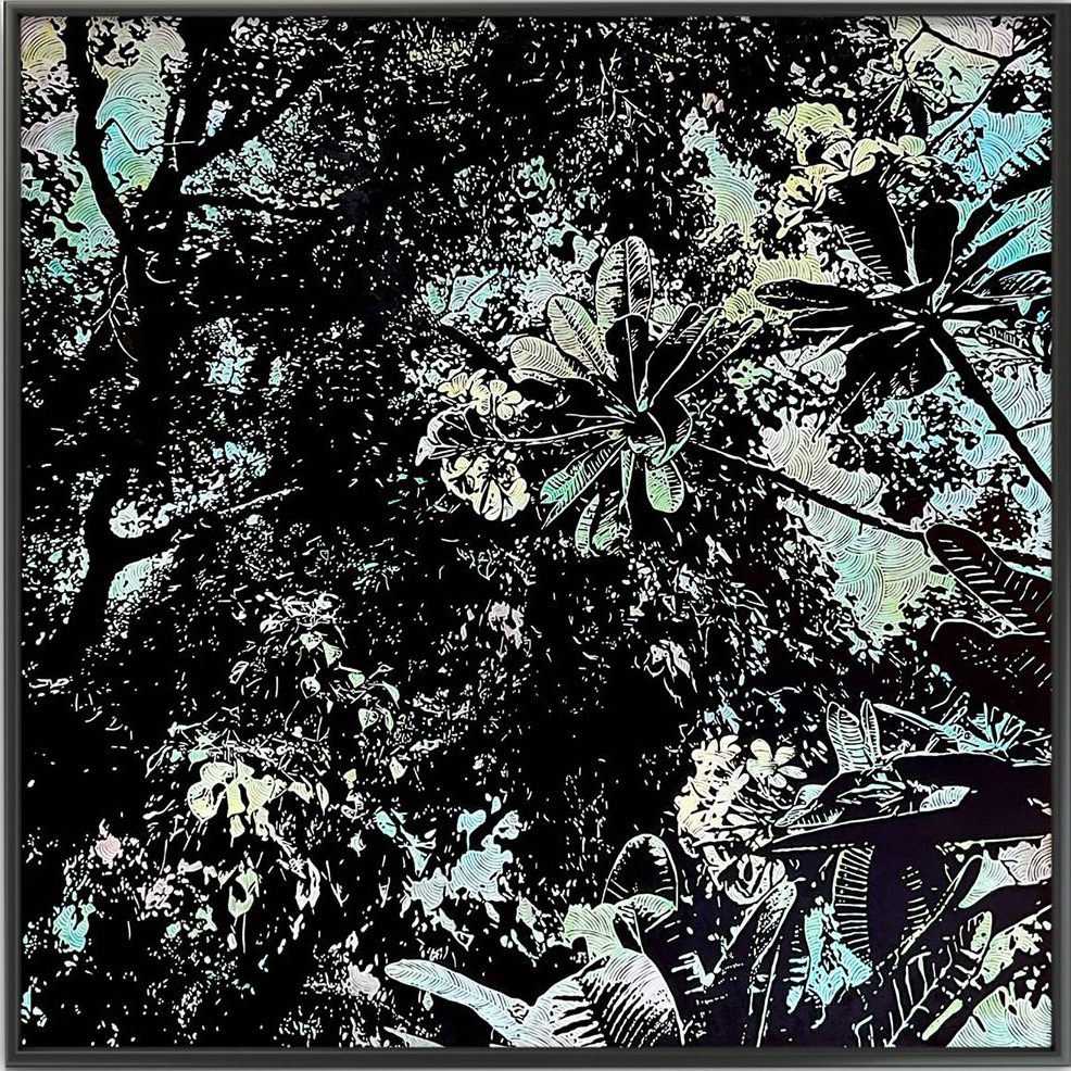 แผ่นไม้ที่เคยทำหน้าที่เป็นแม่พิมพ์จึงถูกนำมาใช้เป็นพื้นผิวของการสร้างสรรค์โดยตรง ลวดลายถูกแกะสลักด้วยมือ ส่วนพื้นที่ที่ไม่ถูกแกะถูกกลิ้งด้วยหมึกภาพพิมพ์เพื่อสร้างน้ำหนักสีดำ ขณะที่ร่องรอยจากการแกะถูกเติมด้วยสีอะคริลิกเพื่อสร้างมิติและความเคลื่อนไหว บางผลงานมีการปัดทองทับบนพื้นผิวหมึกดำ เพื่อเพิ่มชั้นของความหมายและการรับรู้