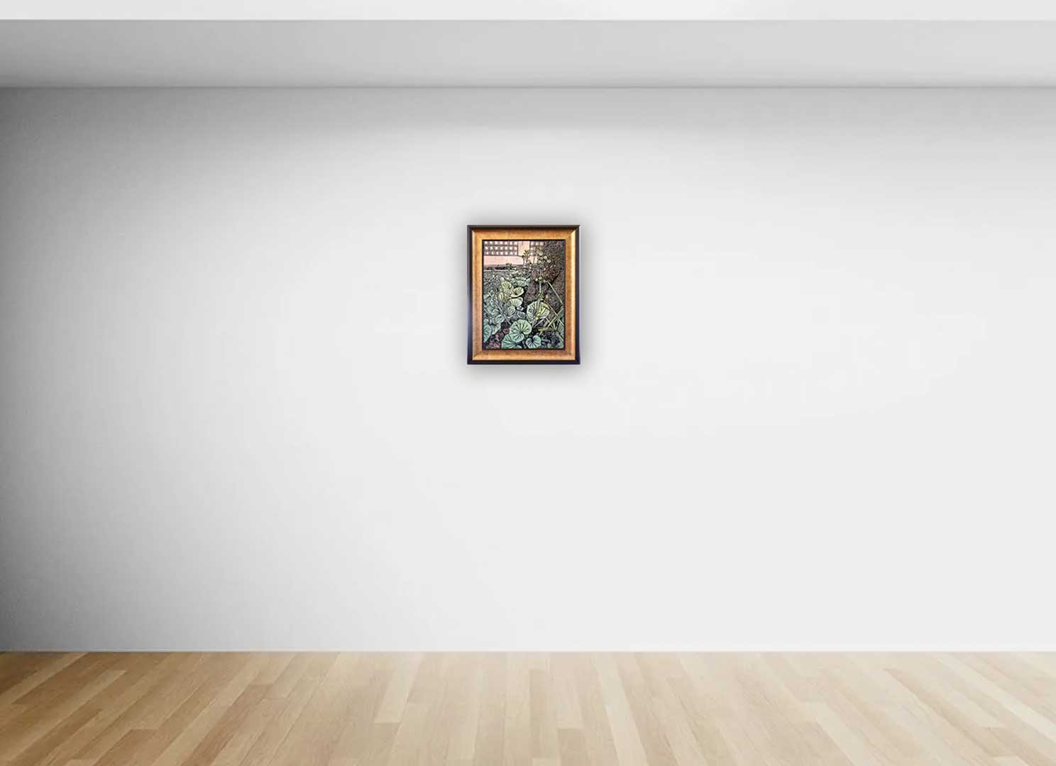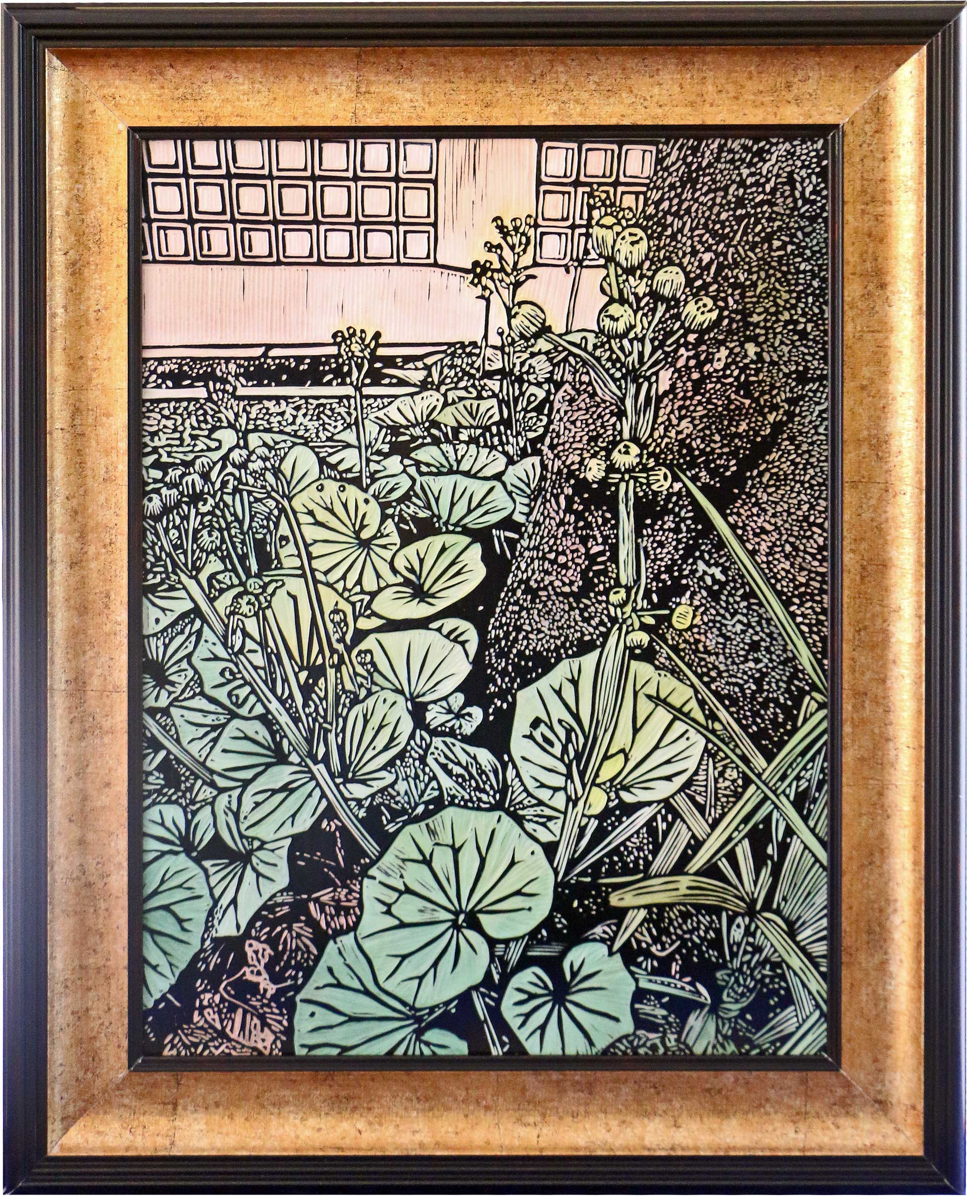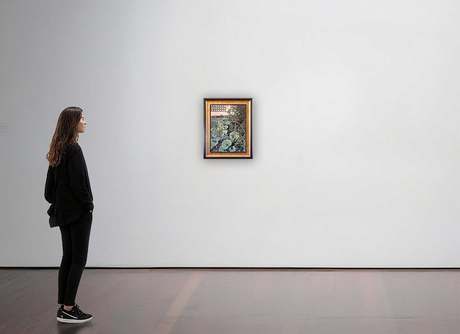 ในงานสื่อผสมชิ้นนี้ ศิลปินถ่ายทอดรายละเอียดของใบไม้ที่เบ่งบานอยู่ใต้ร่มเงาผ่านการ แกะสลักลงบนแผ่นไม้ รอยเซาะที่ประณีตช่วยสร้างจังหวะของพุ่มใบที่ทับซ้อนกันอย่างมีมิติ ก่อนจะแต่งแต้มด้วยสีอะคริลิคในโทนสว่างและเร่งน้ำหนักหมึกพิมพ์เพื่อสร้างความเปรียบต่างระหว่างแสงและเงา (Contrast) เทคนิคนี้ช่วยขับเน้นให้เห็นว่า แม้จะเป็นสิ่งมีชีวิตเล็ก ๆ ที่ดำรงอยู่ใต้ร่มเงา แต่พวกมันกลับมีพลังที่ช่วยเติมเต็มความสมดุลให้แก่พื้นที่ศักดิ์สิทธิ์ได้อย่างน่าอัศจรรย์