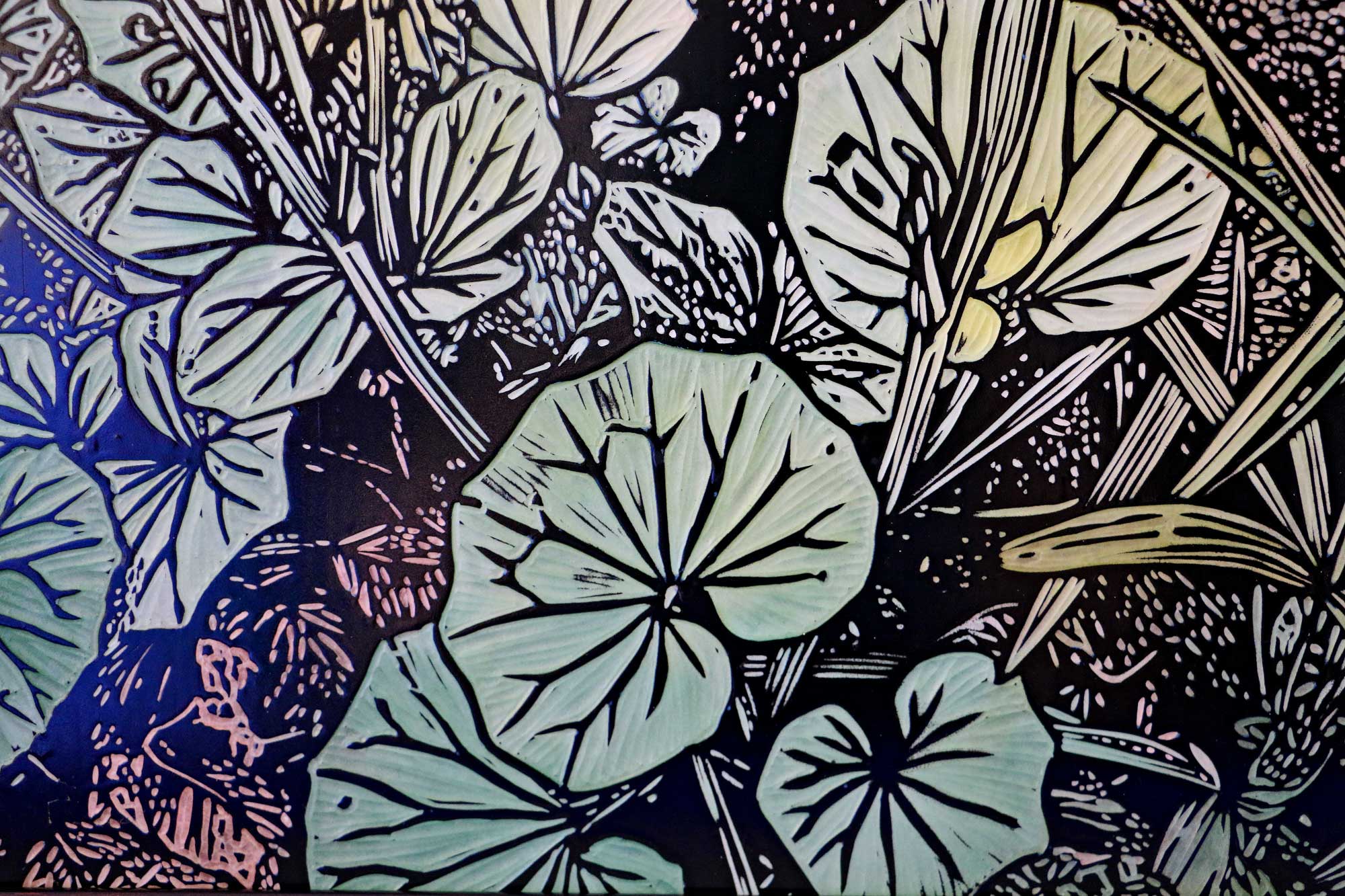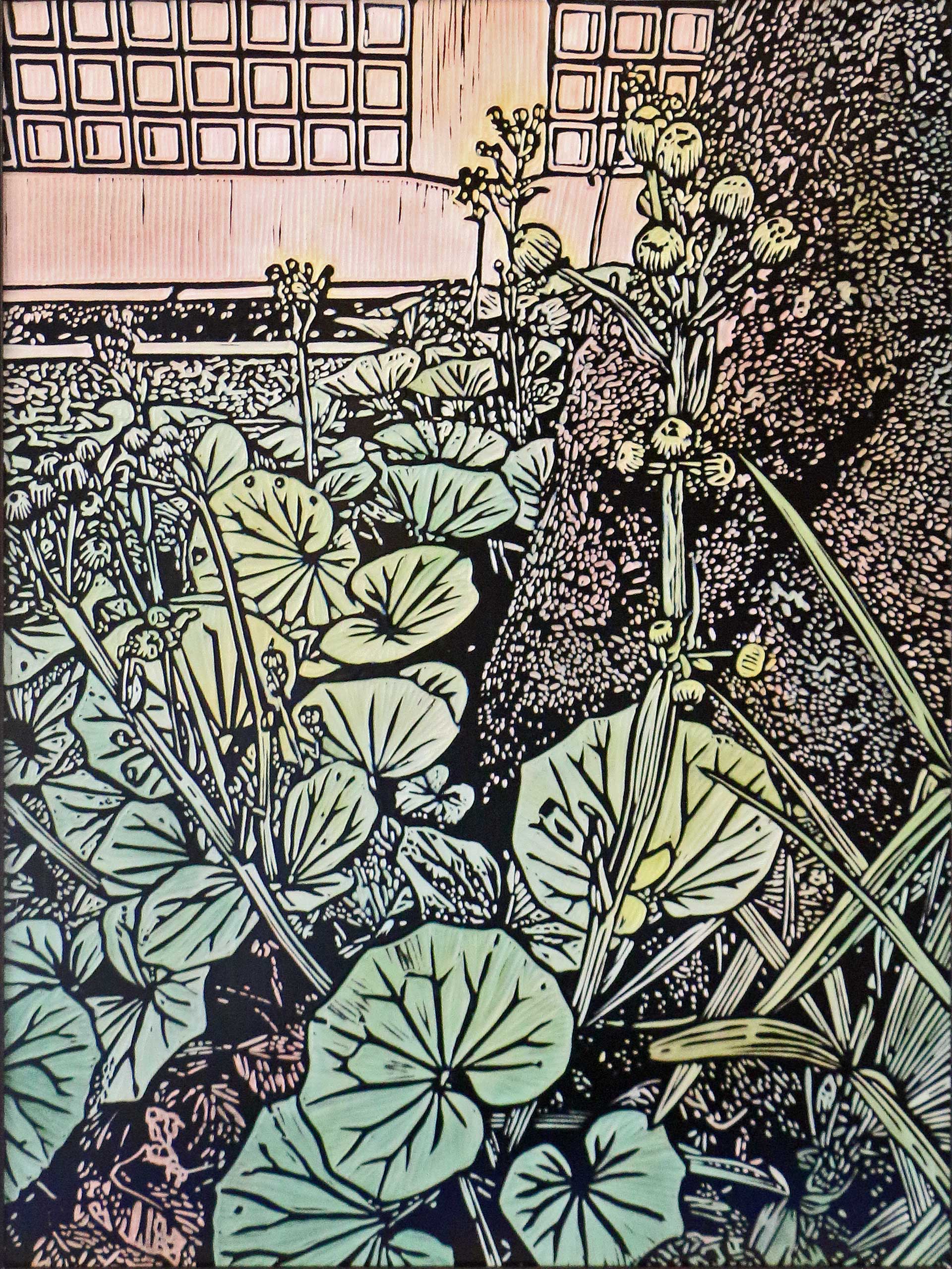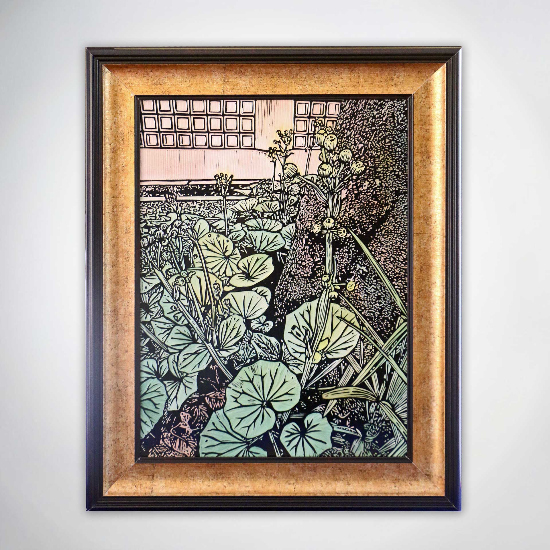 ในงานสื่อผสมชิ้นนี้ ศิลปินถ่ายทอดรายละเอียดของใบไม้ที่เบ่งบานอยู่ใต้ร่มเงาผ่านการ แกะสลักลงบนแผ่นไม้ รอยเซาะที่ประณีตช่วยสร้างจังหวะของพุ่มใบที่ทับซ้อนกันอย่างมีมิติ ก่อนจะแต่งแต้มด้วยสีอะคริลิคในโทนสว่างและเร่งน้ำหนักหมึกพิมพ์เพื่อสร้างความเปรียบต่างระหว่างแสงและเงา (Contrast) เทคนิคนี้ช่วยขับเน้นให้เห็นว่า แม้จะเป็นสิ่งมีชีวิตเล็ก ๆ ที่ดำรงอยู่ใต้ร่มเงา แต่พวกมันกลับมีพลังที่ช่วยเติมเต็มความสมดุลให้แก่พื้นที่ศักดิ์สิทธิ์ได้อย่างน่าอัศจรรย์