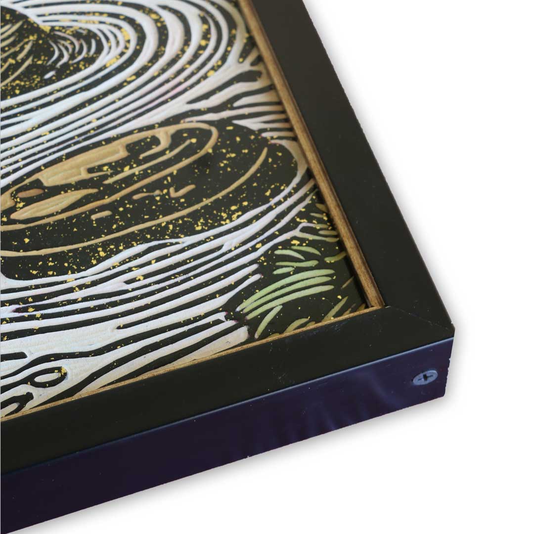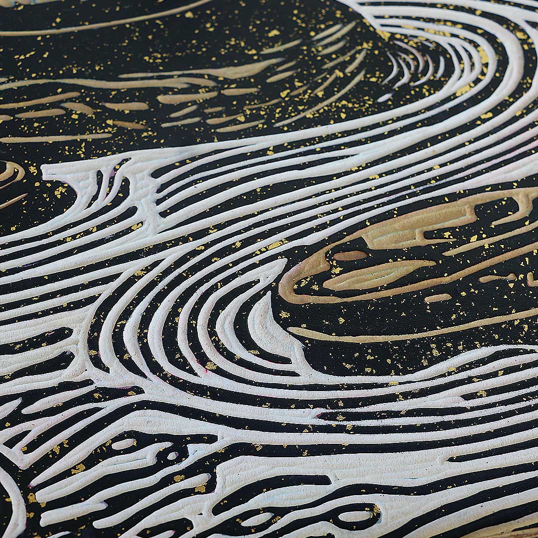 Mixed media on hand-carved relief panel