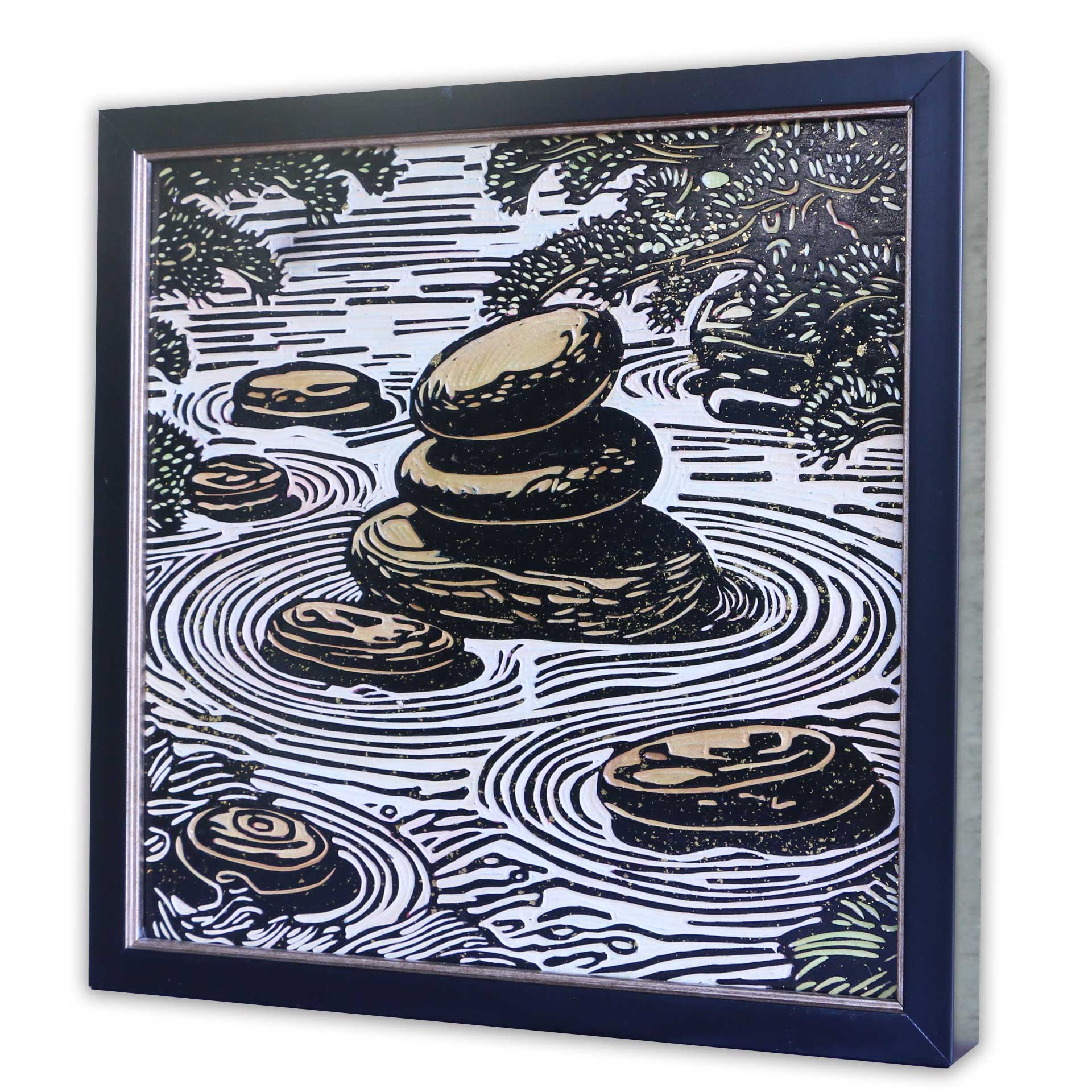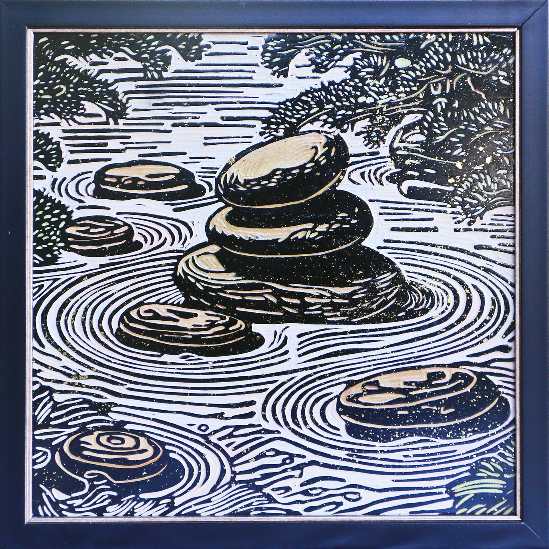 ประกายสีทองที่ถูกปัดลงบนพื้นผิวสีเข้มเปรียบเสมือนพลังงานชีวิตที่หมุนวนอยู่รอบตัวเรา ลายเส้นที่โค้งวนรอบฐานหินในลักษณะระลอกคลื่น มิได้สื่อถึงเพียงผืนทรายหรือสายน้ำ แต่คือสัญลักษณ์ของ “การเคลื่อนไหวในความไม่เคลื่อนไหว” (Motion in Stillness) ซึ่งเป็นหัวใจสำคัญของชื่อผลงานชิ้นนี้