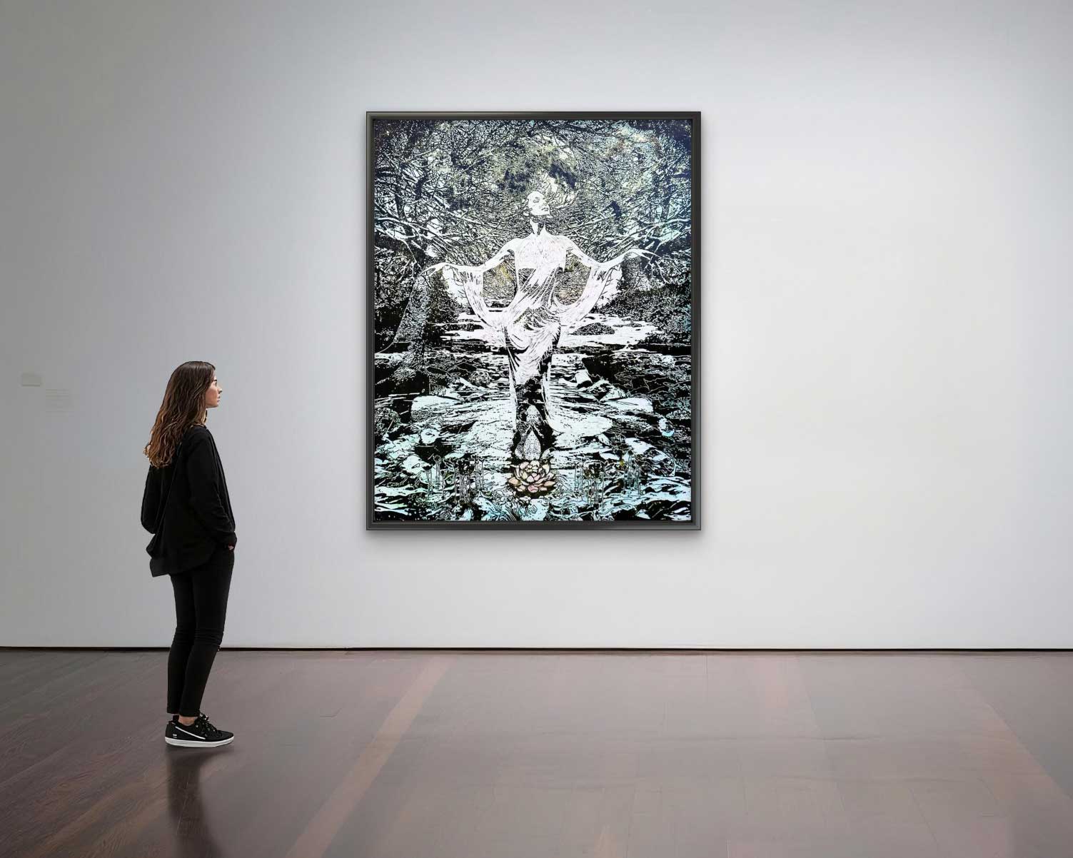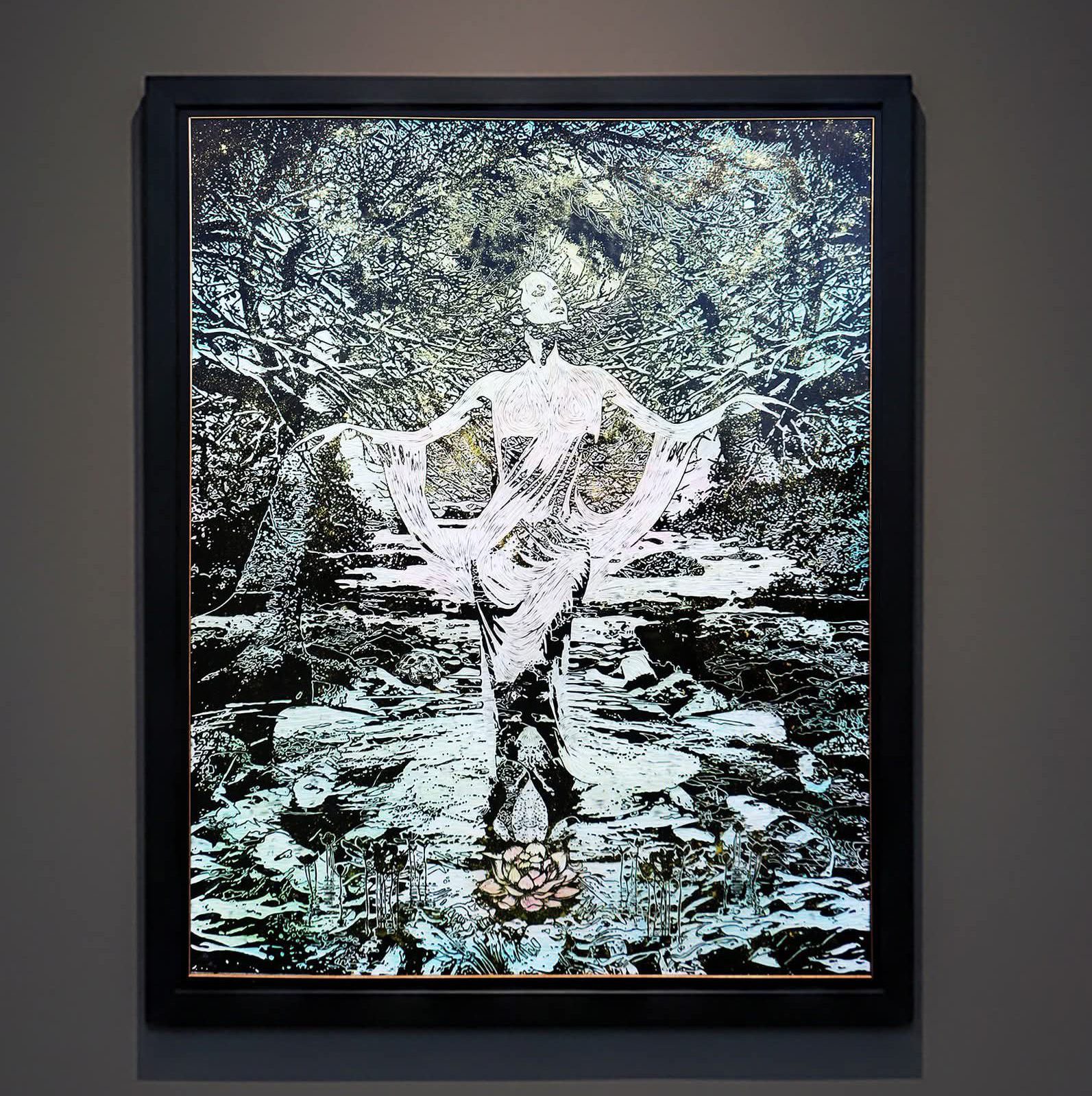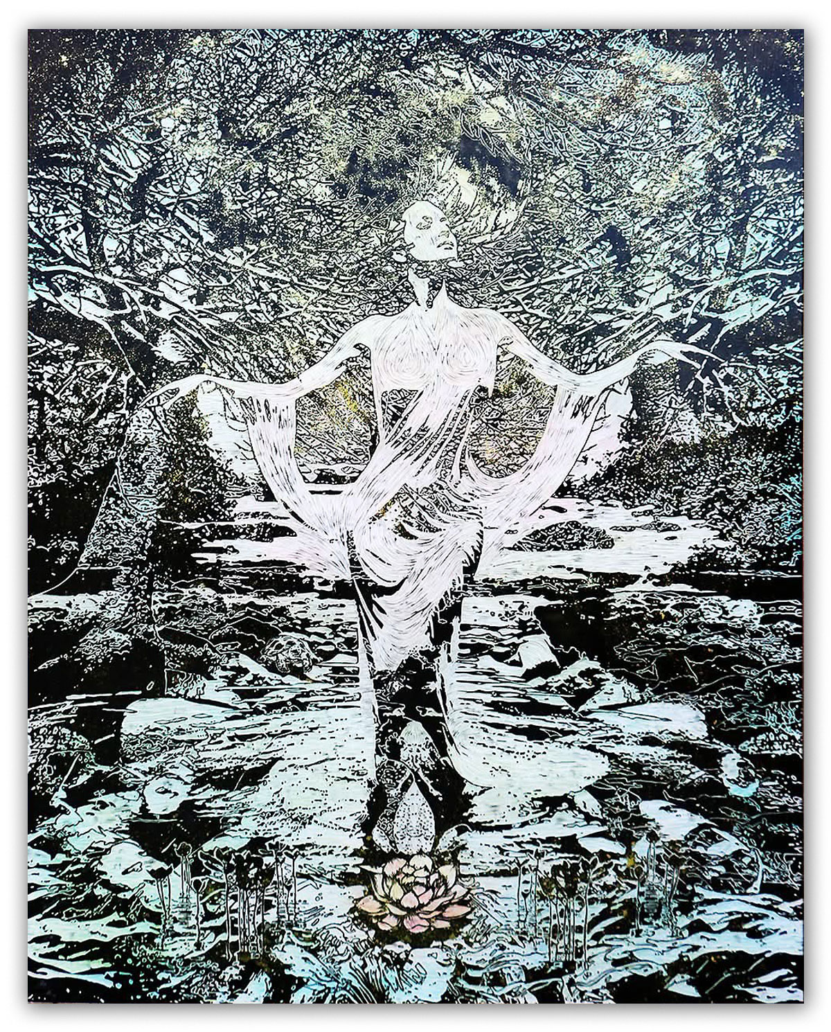 เทคนิคการทับซ้อนของหมึกและสีบนร่องไม้ สื่อถึงสภาวะจิตวิญญาณที่มีความลุ่มลึกและซับซ้อน ร่างของสตรีที่ดูราวกับกำลังละลายกลมกลืนไปกับธรรมชาติ สะท้อนถึงการลดทอนตัวตนท่ามกลางกระแสธารแห่งจักรวาลที่โอบล้อมผู้ชมด้วยขนาดที่โอ่อ่าและโทนสีที่นุ่มนวล