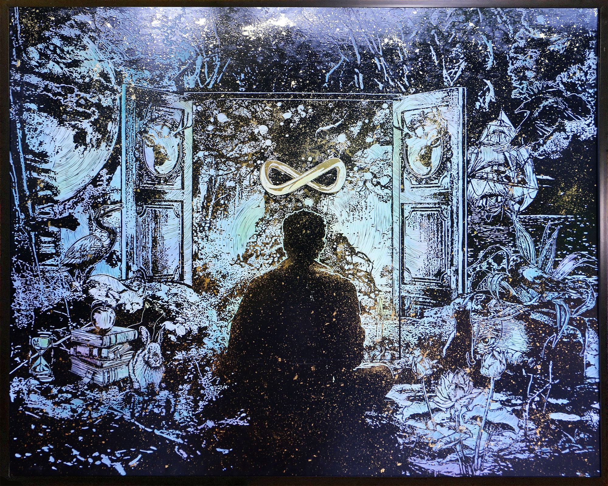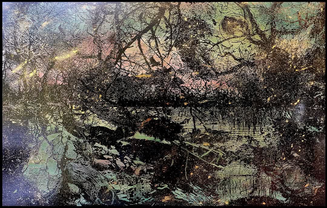 The Rising Whisper of the Waters (เสียงกระซิบที่ดังขึ้นของสายน้ำ) 120 x 120cm , Acrylic-painted wood engraving with gold leaf , 2025